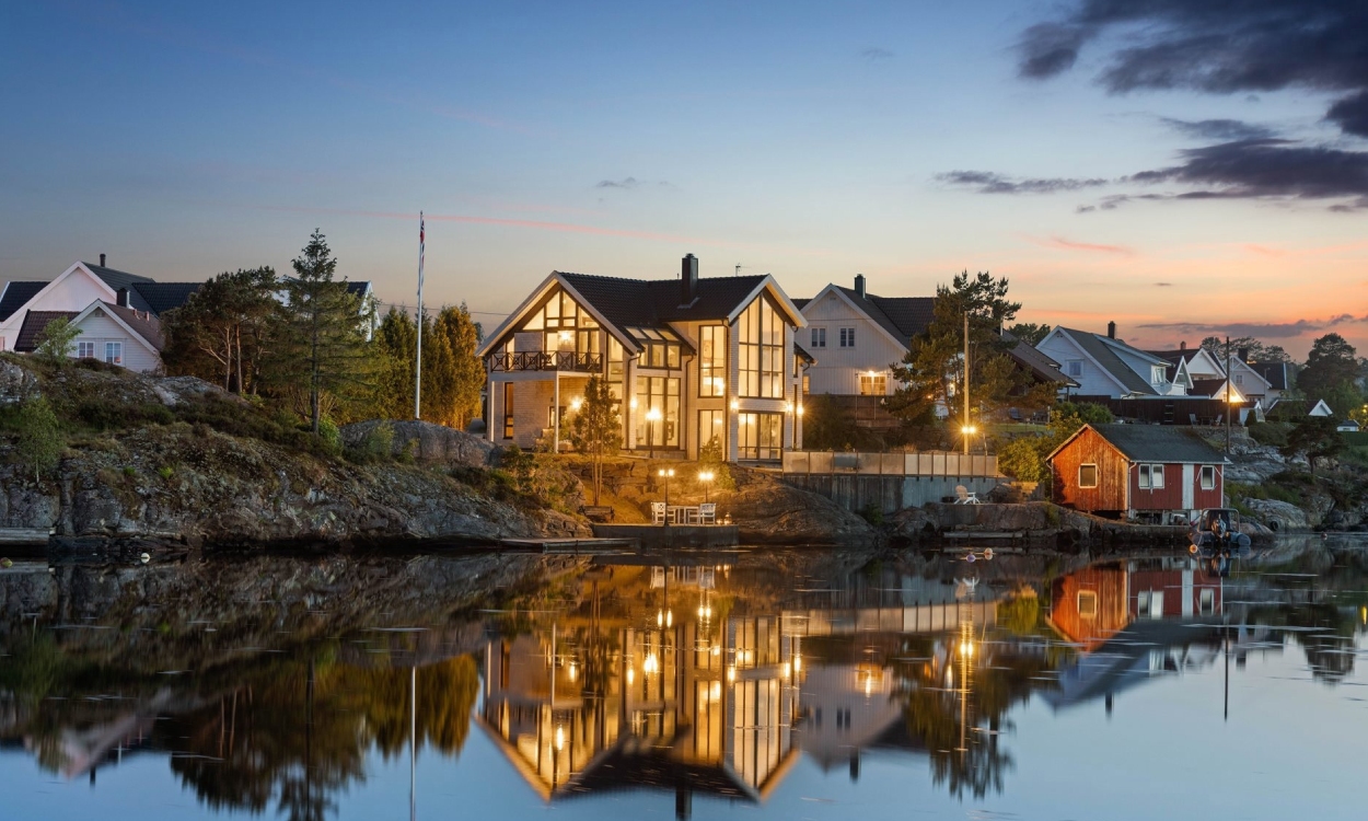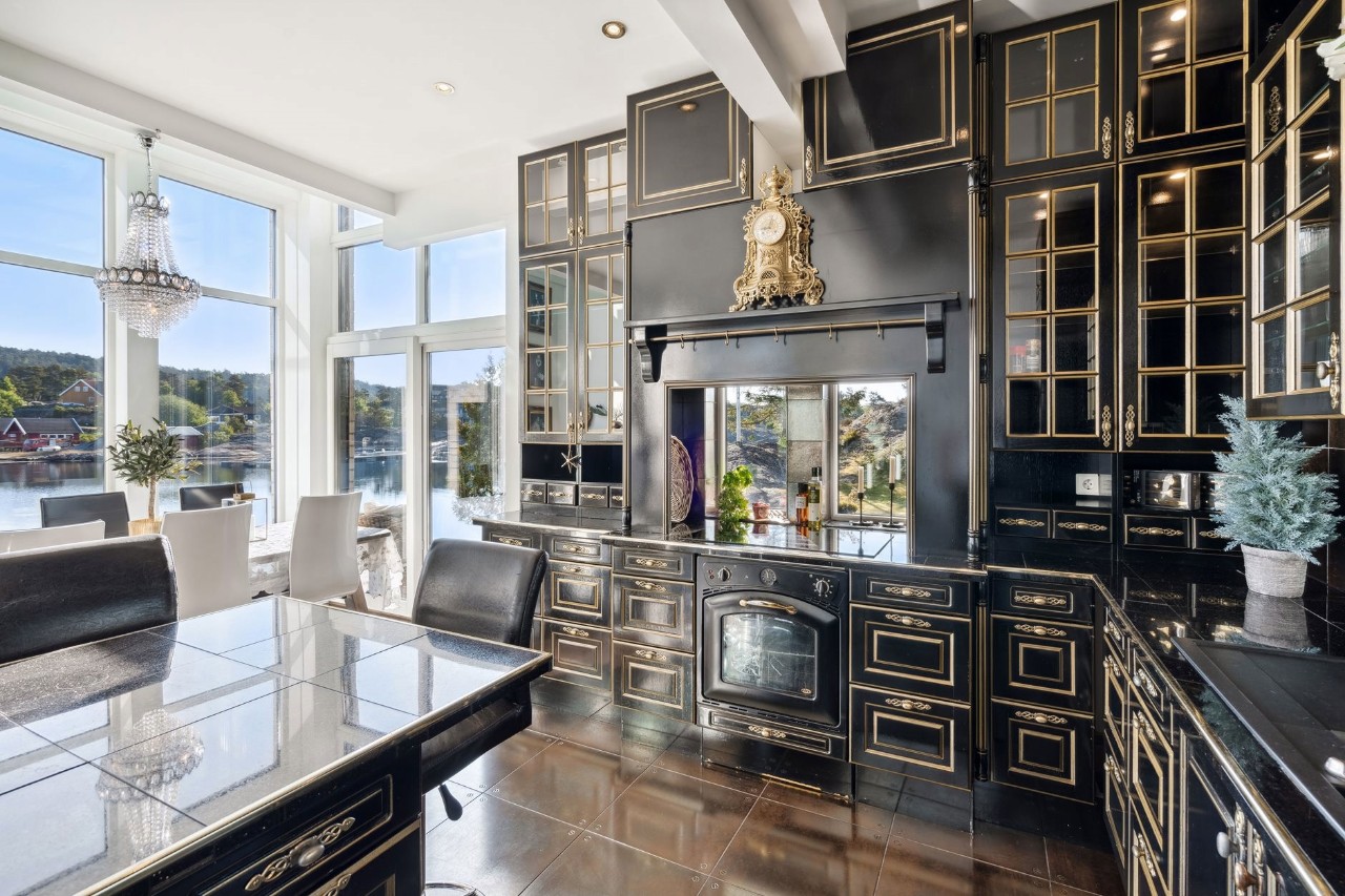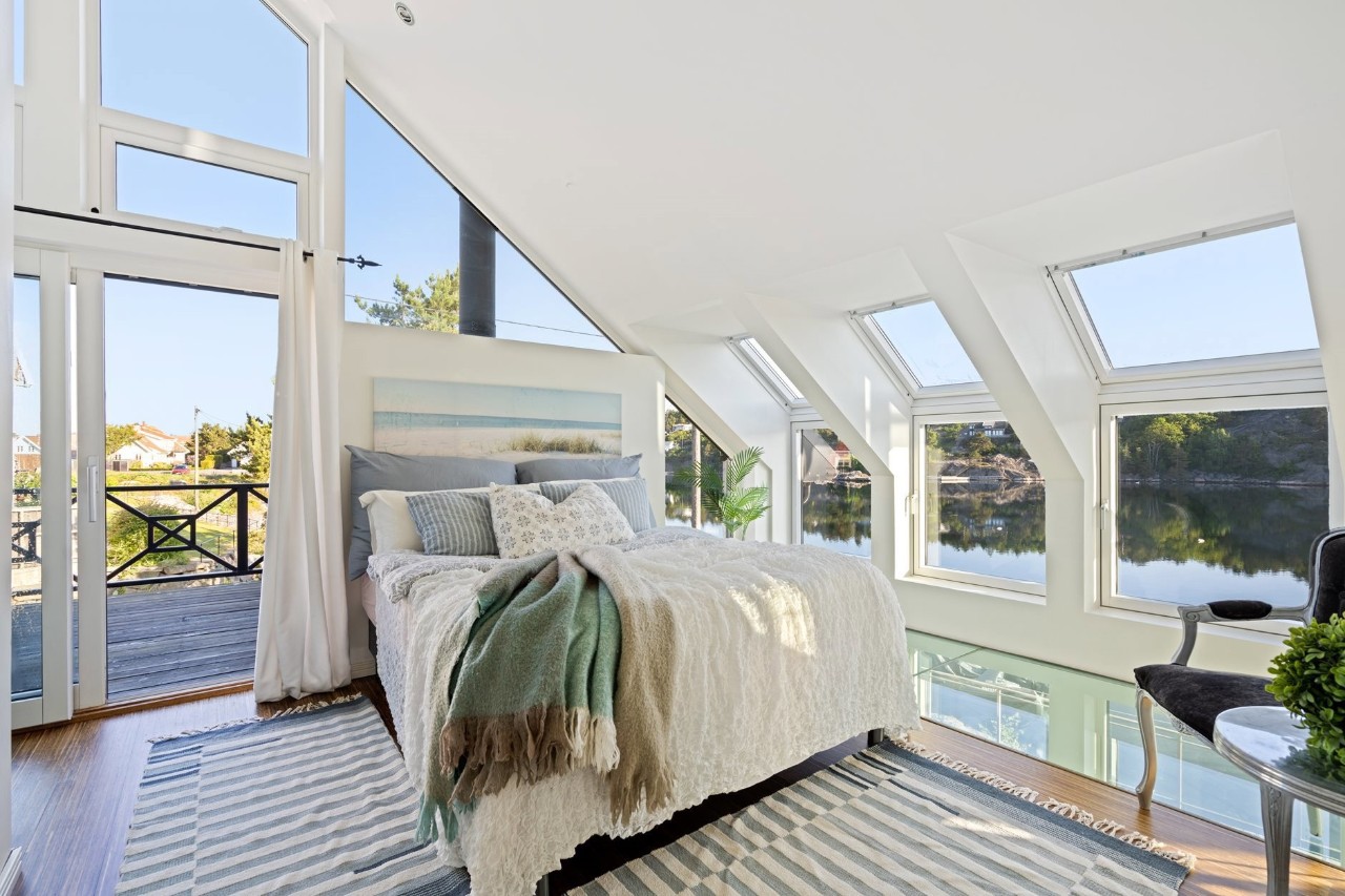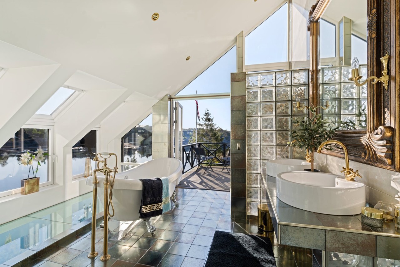 – I den romslige stuen har du store vindusflater fra gulv til tak, flere ildsteder og åpen himling med 3 meter takhøyde. Videre er det blant annet eksklusive glassfliser på gulv, lekkert bad i andre etasje med sjøutsikt fra badekaret og loftstue med mesanin, sier Kåsa Minde. Prisantydning er satt til 13,5 millioner kroner.