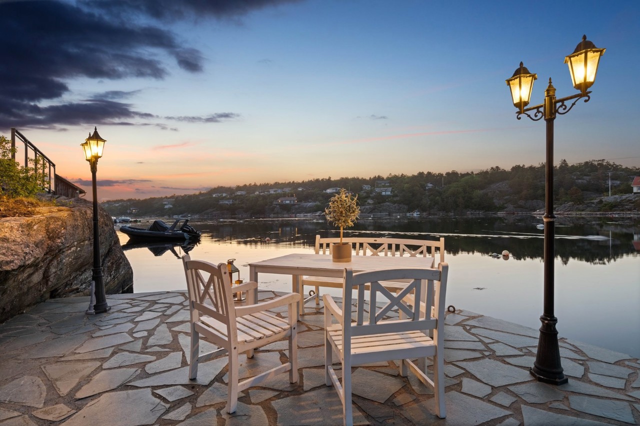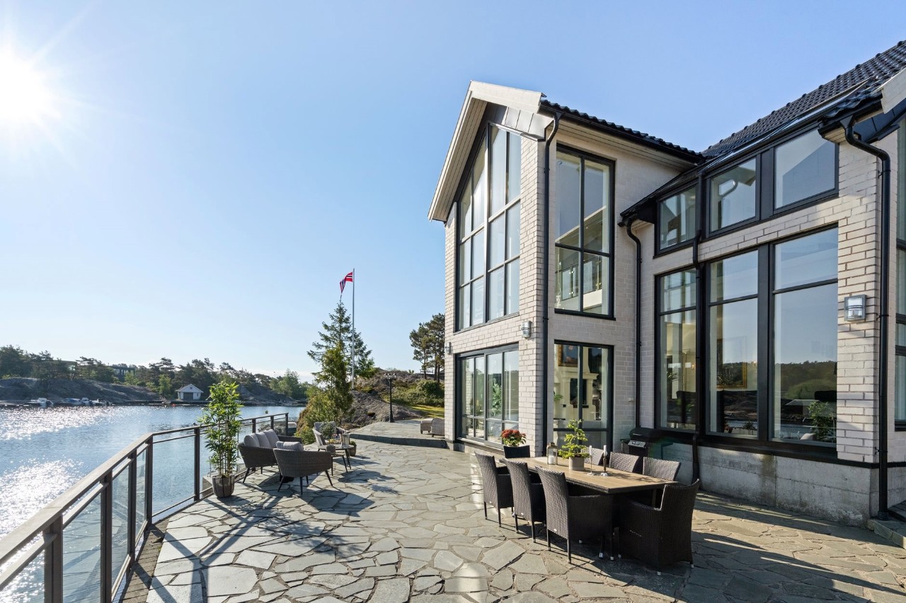 – I forkant av stuen er det en stor steinsatt uteplass med nydelig utsikt mot sjøen og god plass til flere sittegrupper og grill. Dette er en unik eiendom som bare må oppleves.