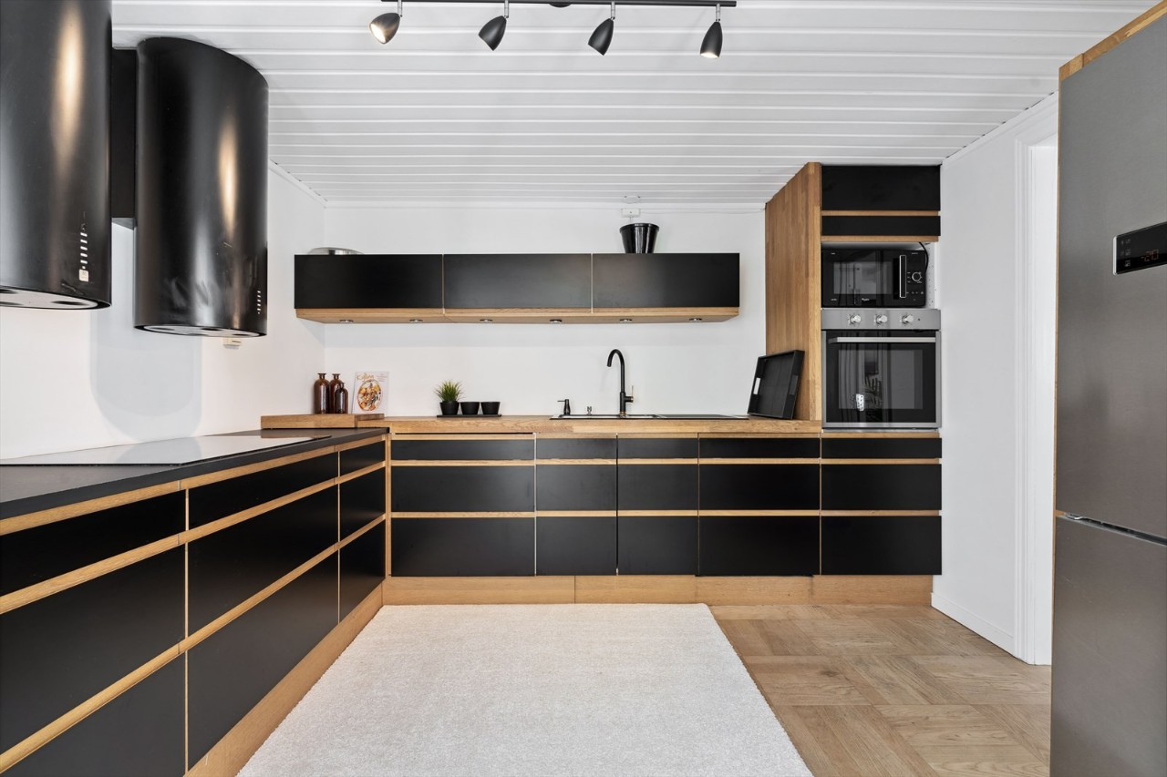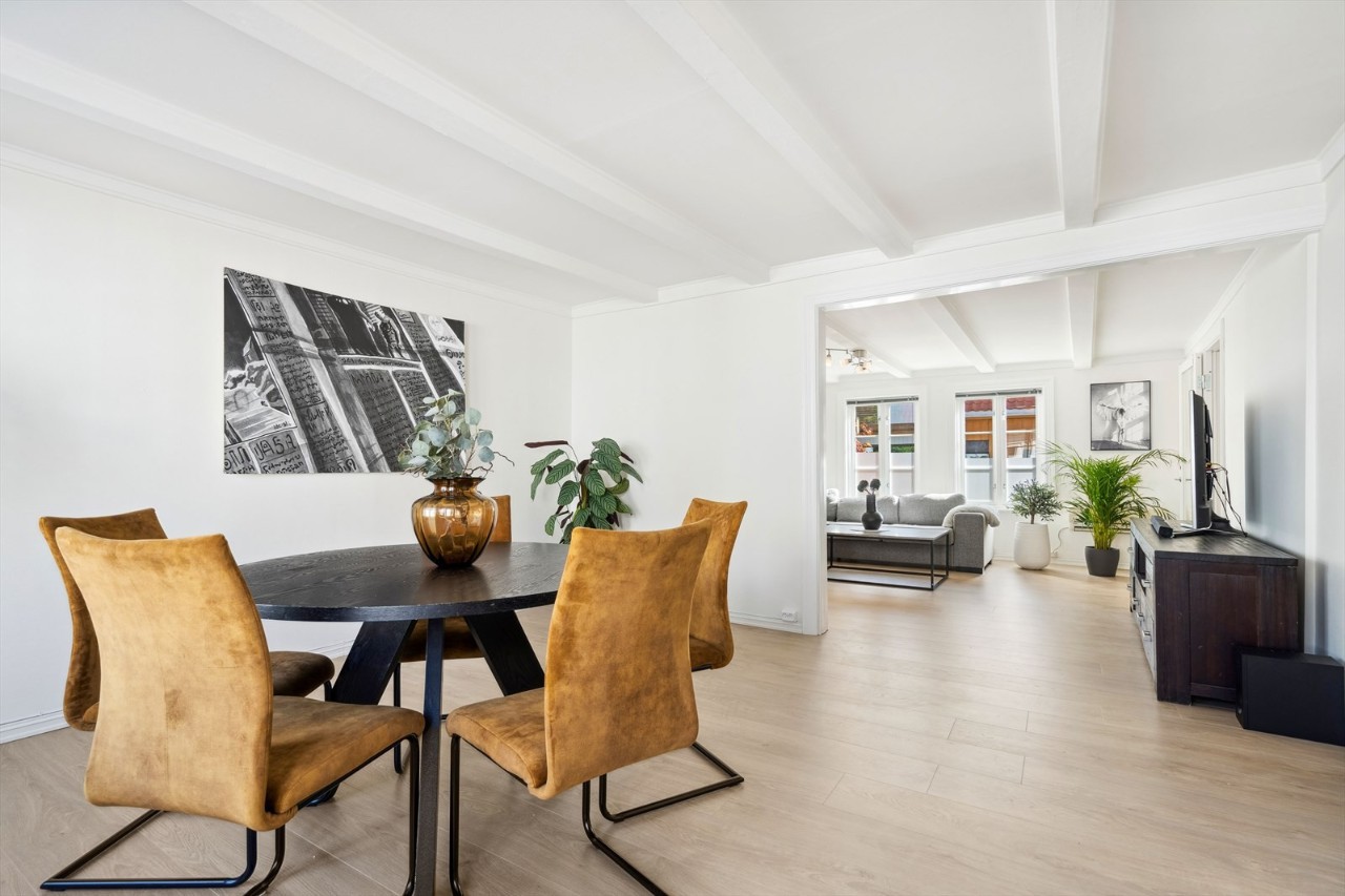 – Det romslige hovedhuset holder normalt god stand med tanke på alder, men enkelte reparasjoner og oppgraderinger må regnes med. Tilbygget i annekset fremstår som strøkent, med flott kjøkken fra Designa i åpen løsning mot rålekker stue med store foldedører med sømløs åpning fra gulv til tak som åpner hele hjørnet i bygget ut mot bakgården.