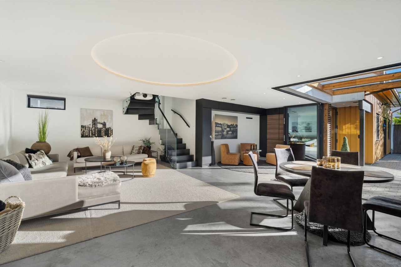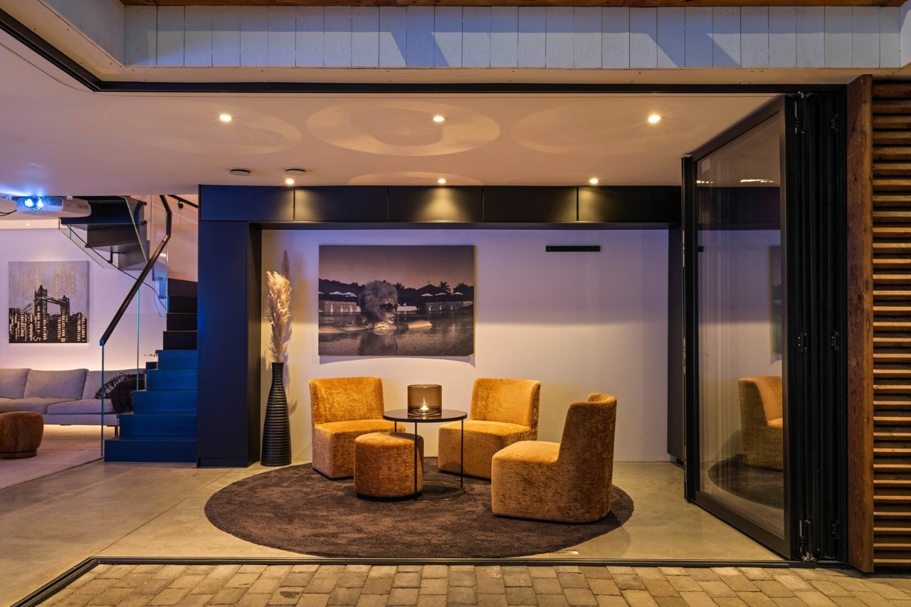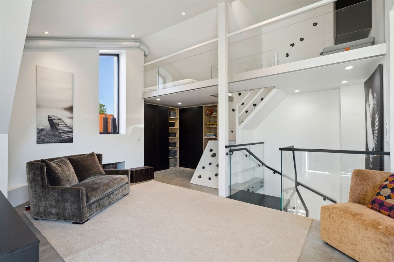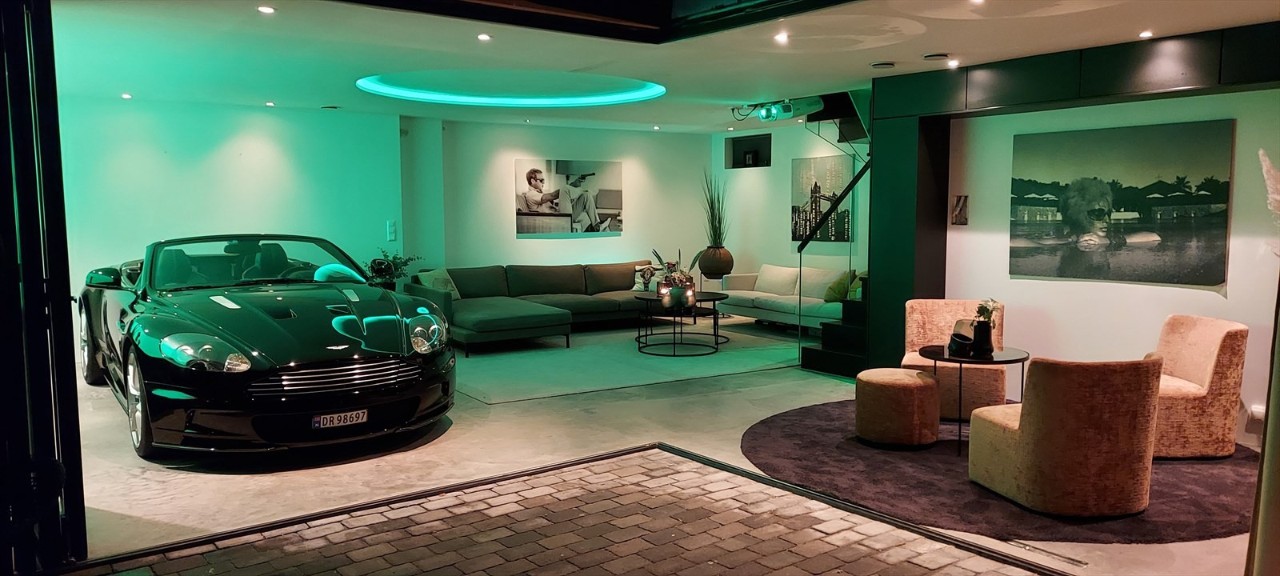 I stua er det blant annet installert en led-lys-bue i taket, gulvet er forsterket med ekstra armering i betongen så du kan kjøre bilen inn her. Rommet har også lydisolerte vegger slik at du kan spille høy musikk uten å plage naboene, og det er klatrevegg fra andre etasje til hemsen. På verandaen er det glassdekket gulv som slipper sollyset gjennom til uteplassen under. Prisantydning er satt til 15,5 millioner kroner.