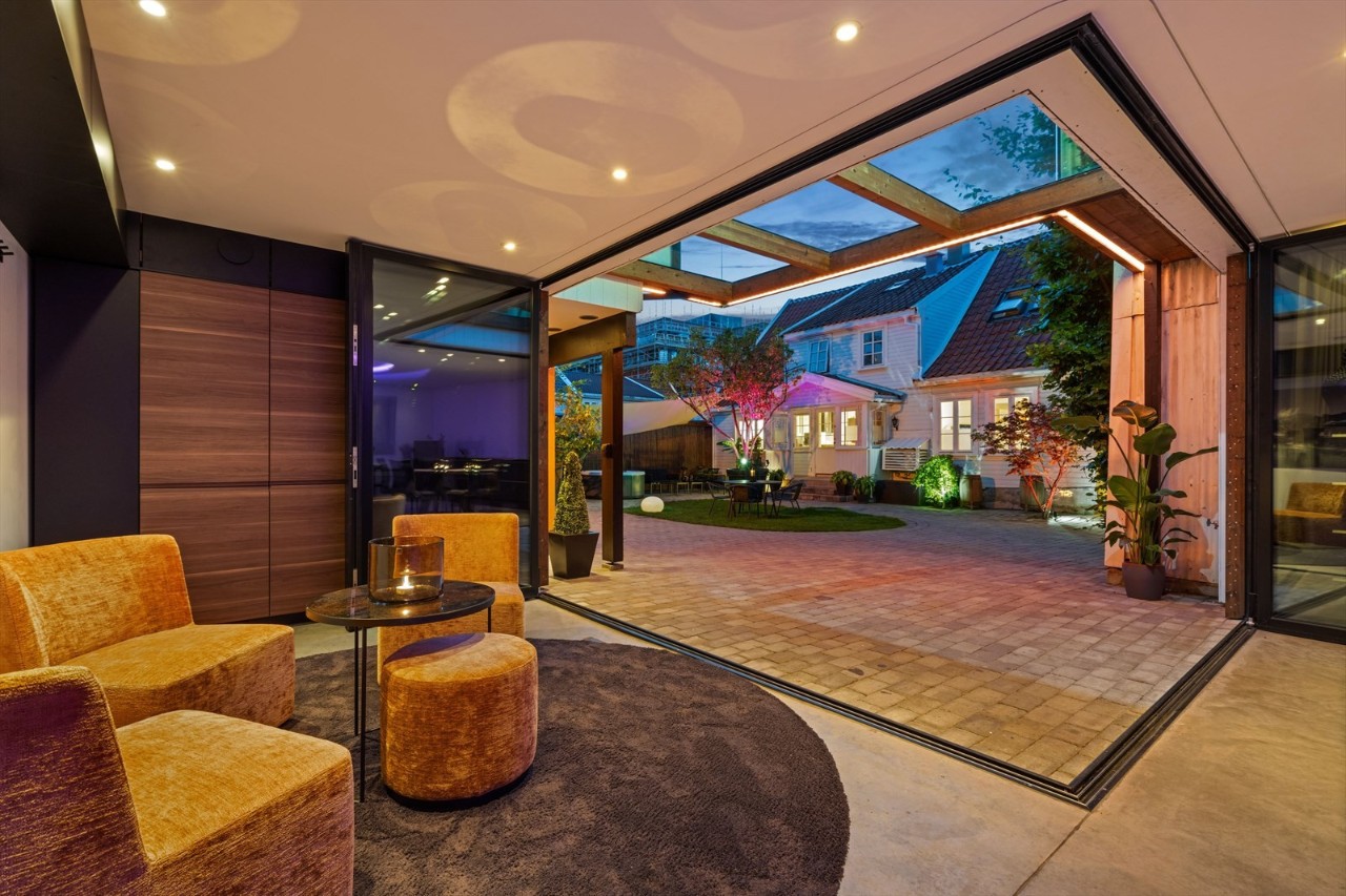 Eiendommen føyer seg tilsynelatende sømløst inn den idylliske trehusbebyggelsen i Tordenskiolds gate i Kvadraturen i Kristiansand, men i bakgården åpenbarer det seg et påkostet tilbygg av den helt spektakulære sorten.