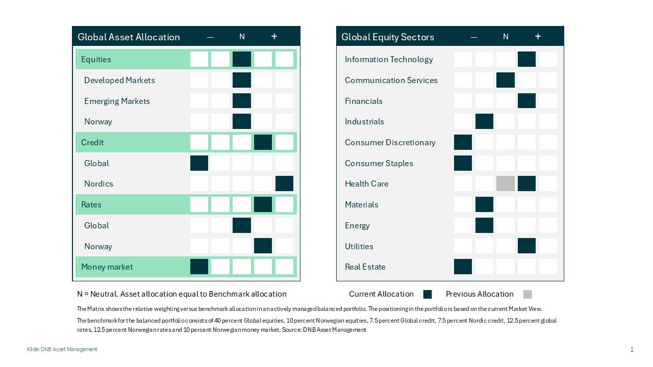 Vi beholder vår overvekt i kreditt, med størst vekt i nordiske høyrentepapirer, og vi beholder nøytral vekt i aksjer. Innenfor aksjeporteføljen øker vi eksponeringen i helse fra nøytral til overvekt.