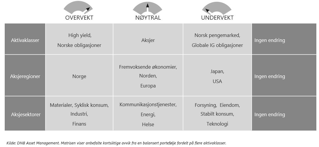 - Vi er positive til aksjer på mellomlangsikt, men ser at de er utsatt hvis det skulle komme skuffelser. Vi mener derfor det er riktig å ligge nøytralvektet aksjer.