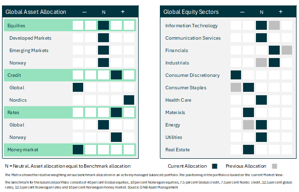 Basert på makrotall, utsikter til finanspolitisk stimulans i både USA og Europa, og stabile eller fallende renter i de fleste store markeder, synes vi det er riktig å øke eksponeringen mot sykliske sektorer og regioner. Denne prosessen startet vi med allerede i starten av året, ved å kjøpe bred eksponering mot globale småbedrifter (Small Caps).