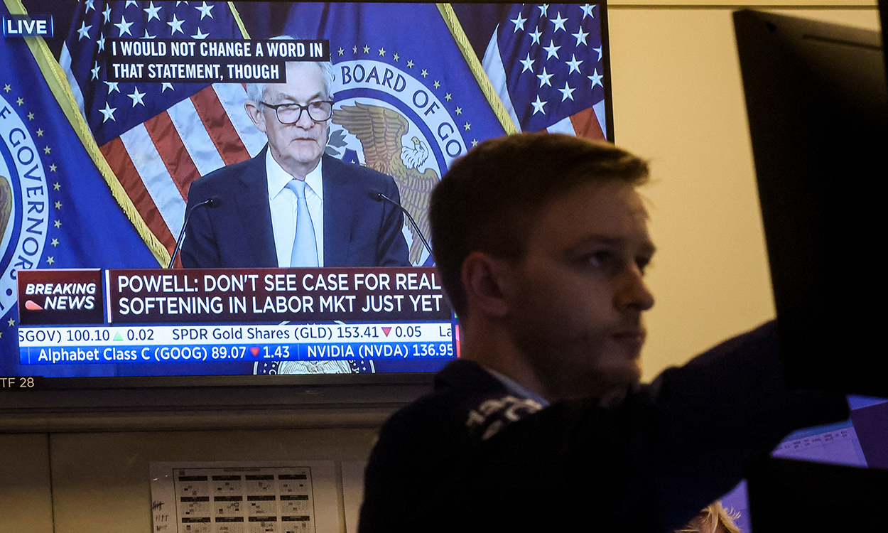 Langt mer haukaktige signaler på pressekonferansen. Powells kommentarer på pressekonferansen fikk imidlertid markedsutviklingen til å slå kontra. På den fremstår nemlig Powell som langt mer haukaktige når han sier at det er prematurt å tenke på å avslutte rentehevingene, at rentetoppen ligger an til å bli høyere enn antatt i september (som var 4,6 prosent i slutten av 2023 ifølge dot-chartet), at det er en fare for at inflasjonen biter seg fast og at Fed trolig gjør en mindre feil om de hever for mye enn om de hever mindre enn nødvendig.