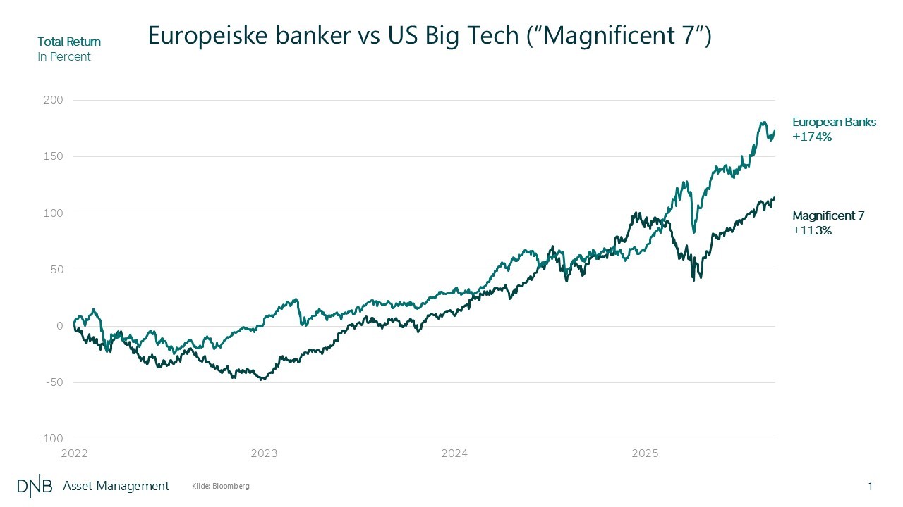 De siste årene har mye av oppmerksomheten i aksjemarkedet vært rettet mot de amerikanske teknologigigantene – «Magnificent 7». Likevel er det en annen sektor som har levert enda bedre avkastning: europeiske bankaksjer.