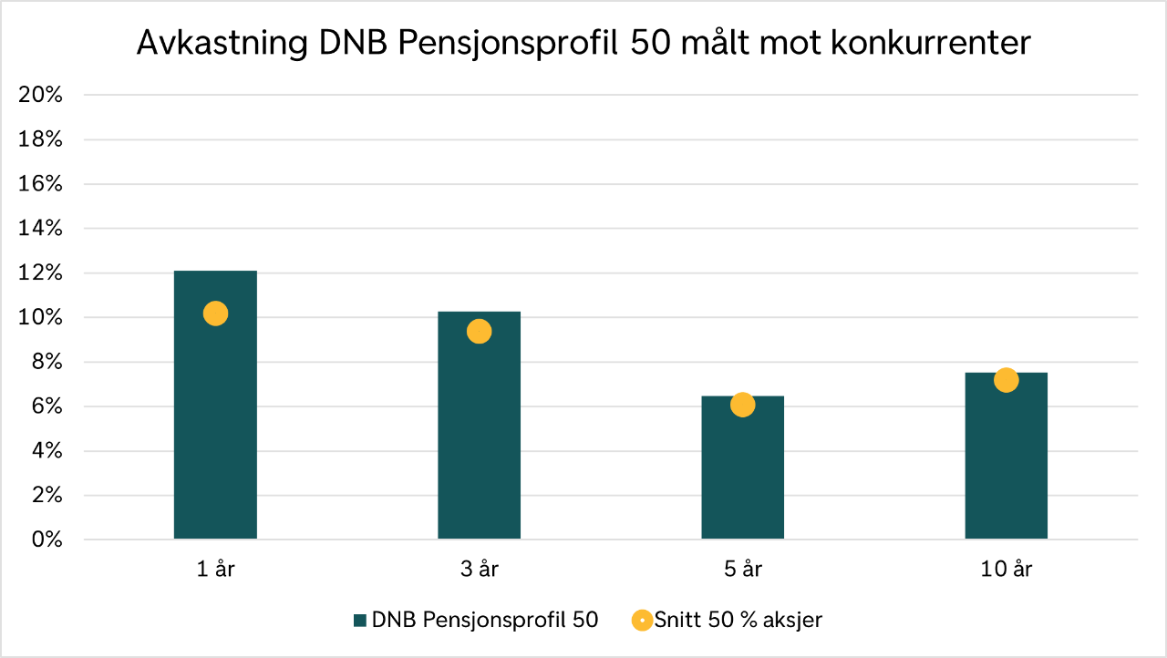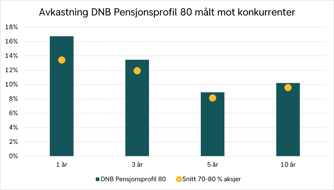 Nye tall fra Avkastningsportalen per 31.3.2026 viser at DNBs pensjonsprofiler klarer seg godt i konkurransen både over 1, 3, 5 og 10 år, når vi sammenligner med gjennomsnittet av tilsvarende pensjonsprofiler.