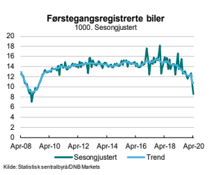 Antall førstegangsregistrerte biler var i april det laveste siden finanskrisen. Basert på våre nye makroprognoser anslår vi nå at bilsalget kan komme til å havne på kun rundt 100 000 biler i år.