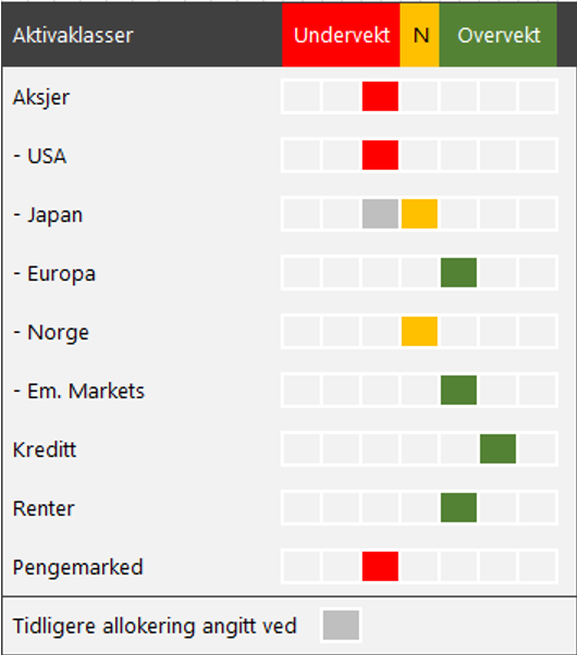 – Vi mener at det fortsatt er grunn til å være forsiktig, og opprettholder derfor en moderat undervekt i aksjer versus renter og kreditt, samt at aksjeporteføljen vris i defensiv retning, sier Sørensen.