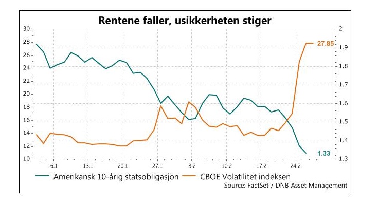 Nyheter om spredning av koronaviruset i Europa i helgen slo hardt ut. Usikkerheten økte kraftig og børsene begynte å falle. Farestveit forklarer at vi nå har fått en markedssituasjon med en ukjent variabel.