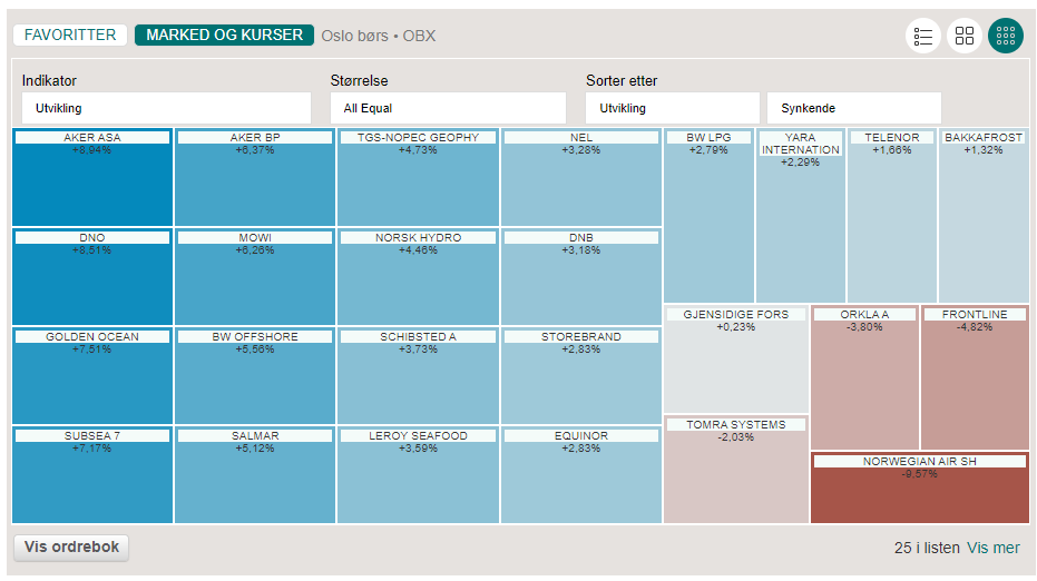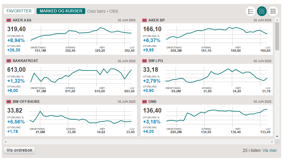 Med det utvidede innholdet og bedre funksjonalitet kan du uavhengig av hvor selskapet er notert raskt å skifte mellom selskap og dermed enklere sammenligne verdsettelsen av aksjer innenfor samme sektor eller bransje. Hvordan ser for eksempel direkteavkastningen i Equinor og Aker BP ut i forhold til Shell eller BP? Og når kommer de forskjellige selskapene med utbytte? Hvordan er Orkla verdsatt på P/E i forhold til Unilever eller Procter & Gamble, og hvilken P/Sales handles Alcoa på i forhold til Norsk Hydro? Nøkkeltallene finner du nede til venstre på siden for hvert enkelt selskap.