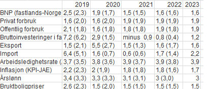 Tabellen viser DNB Markets prognoser for utviklingen i norsk økonomi, med prognosene fra forrige rapport (august 2019) i parentes.