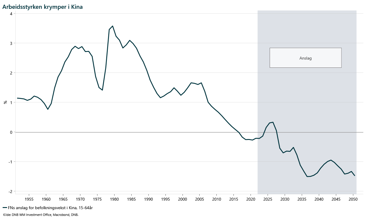 I 2022 var kinesisk befolkningsvekst negativ for første gang på veldig lang tid, og det markerer et slags vendepunkt for den demografiske utviklingen i verdens nest største økonomi. Ser vi på det som av økonomene klassifiseres som den arbeidsføre delen av befolkningen, nemlig aldersgruppen 15–64 år, indikerer anslag fra FN at veksten vil falle raskere og raskere i årene som kommer.