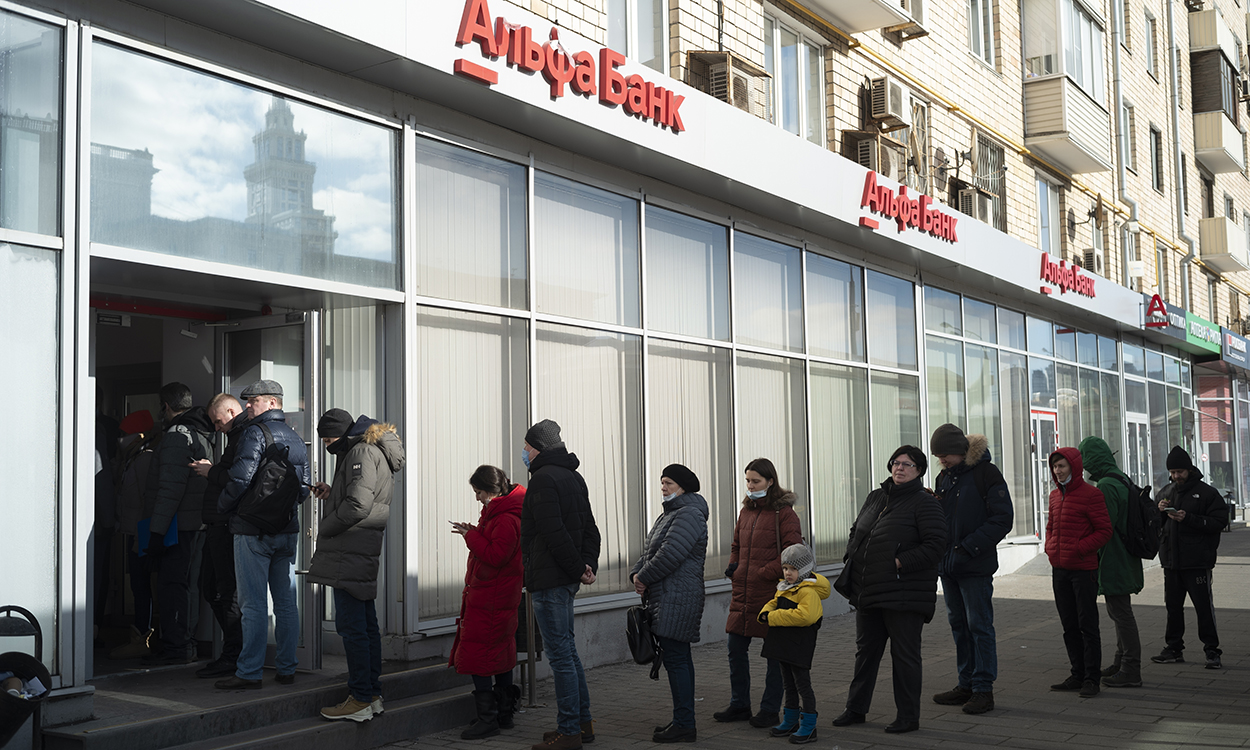 Videoer fra Russland viser lange køer med russere som prøver å ta ut kontanter fra minibanker, mens den russiske sentralbanken kom med en oppfordring om å beholde roen, i et forsøk på å unngå at folk tømmer kontoene sine. Verken Visa eller MasterCard blir nå akseptert for dem som har internasjonale bankkontoer.