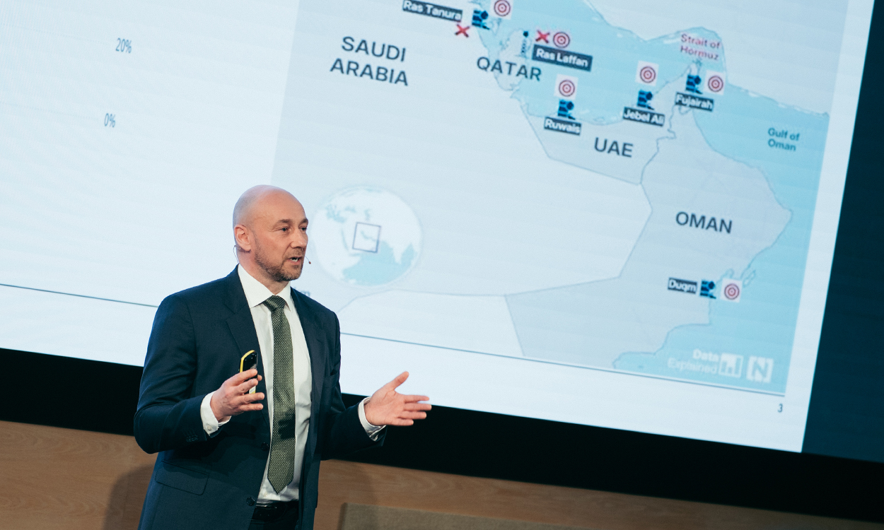 På konferansen DNB Invest gikk Helge André Martinsen, energianalytiker i DNB Carnegie, gjennom situasjonen i verdens energimarkeder som følge av konflikten i Midtøsten og stengningen av Hormuzstredet.