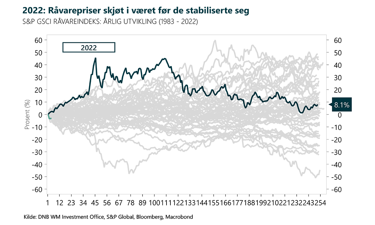 Den brede råvareindeksen til S&P reflekterer oppgangen i olje og gass, men også at råvarepriser generelt sett falt tilbake i andre halvdel av 2022. Det er flere årsaker til at råvareprisene har kommet ned, som for eksempel overraskende sterk lagerbygging av gass i Europa, og frykt for en global resesjon og påfølgende lavere oljeetterspørsel.