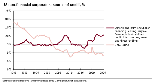Large capital-intensive industries have relied on non-bank financing structures for decades. In the US corporate market, non-bank loans have historically been the second-largest source of credit after corporate bonds. Before 2010, this included: