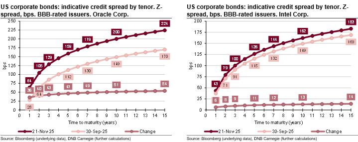 The widening within tech is also highly concentrated, driven mainly by Oracle. Its bonds have repriced by roughly 35–50bps since the end of Q3. Another large BBB-rated tech issuer, Intel, has seen only modest spread moves of 8–13bps across most maturities.