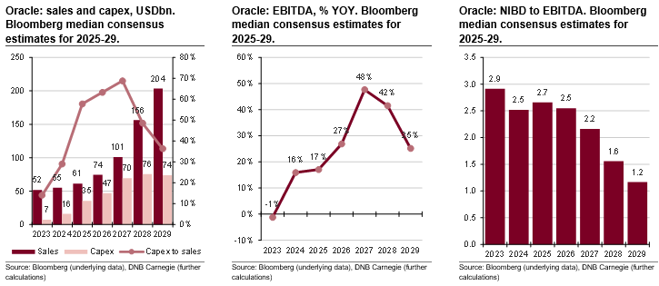 The market reaction to Oracle is understandable. The company is undertaking unusually large investments, with Bloomberg consensus estimating capex at 58% of sales this year and above 60% in the next two years. Consensus also expects this spending to drive earnings meaningfully higher, with EBITDA forecast to rise nearly 30% next year and 40–50% in the two years after that. If this materialises, leverage should gradually normalise from today’s elevated levels.