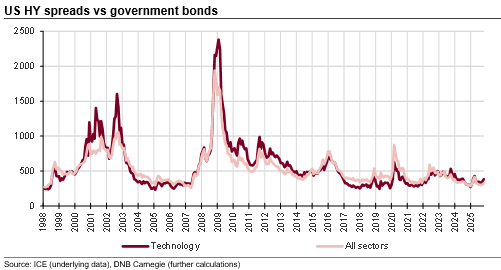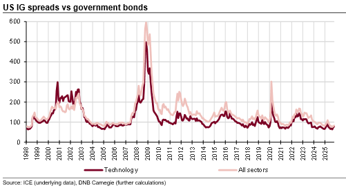 The picture is similar in investment grade. US tech spreads have risen from 66bps at the end of last year to 79bps last Friday. Broad-market spreads are broadly unchanged at 83bps. Historical medians are 102bps for tech and 129bps for the broad market. As with HY, tech has therefore seen an isolated repricing, but absolute levels remain tight relative to history.