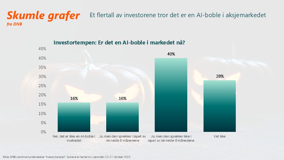 Den semi-månedlige spørreundersøkelsen Investortempen, der ~10 000 av de meste aktive privatinvestorene til DNB blir spurt om sine forventninger til aksjemarkedet, viser at et klart flertall tror vi har en AI-boble i aksjemarkedet. Ganske skummelt, men positivt at 40 prosent ikke tror boblen sprekker i løpet av de neste 6 månedene.