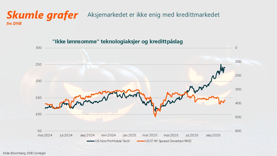 Goldman Sachs «non profitable tech» indeks som består av 67 amerikanske teknologiaksjer med forventet inntjening langt fram i tid har steget kraftig de siste månedene. Samtidig har kredittpåslagene, altså det ekstra rentepåslaget investorer krever for å holde selskapsobligasjoner fremfor statsobligasjoner, steget markert. Kredittmarkedet og aksjemarkedet har altså beveget seg i motsatt retning i denne perioden. Det er skummelt for aksjeinvestorene hvis kredittmarkedet har rett.