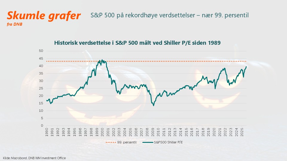Den amerikanske aksjeindeksen S&P 500 handles nå på et verdsettelsesnivå som historisk sett hører til sjeldenhetene. Målt ved Shiller P/E, også kjent som CAPE (Cyclically Adjusted Price-to-Earnings Ratio), nærmer indeksen seg krysningspunktet ved sitt 99. persentil. Den eneste gangen denne grensen har blitt krysset før, er under dot.com-boblen i perioden 1999–2000.
