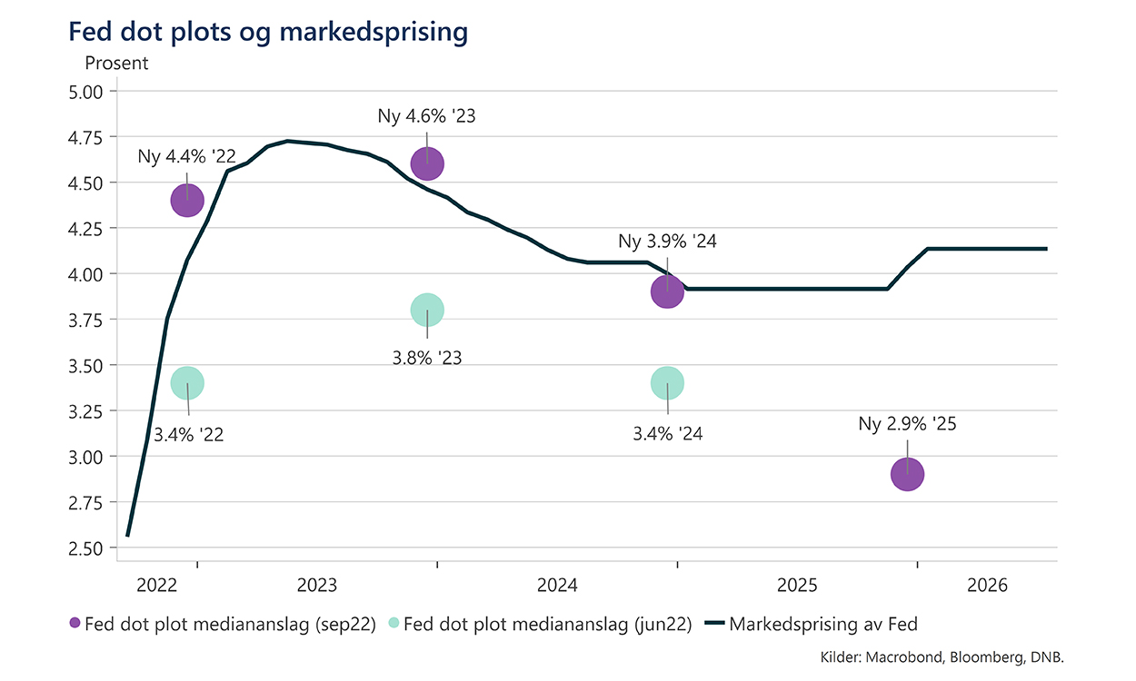 Ved rentebeslutningen i USA var beskjeden «høyere rente, lenger». Markedets forventning til styringsrenten fremover i tid steg også, men divergerer fortsatt fra estimatene til Fed. Sentralbankens egne anslag viser en høyere rente ved slutten av neste år, og nedgang først i 2024. Rentemarkedet priser at Fed kommer til å kutte renten i andre halvdel av 2023.