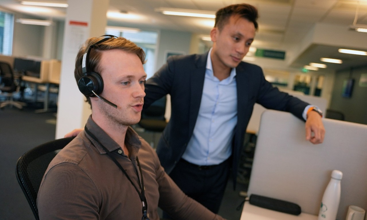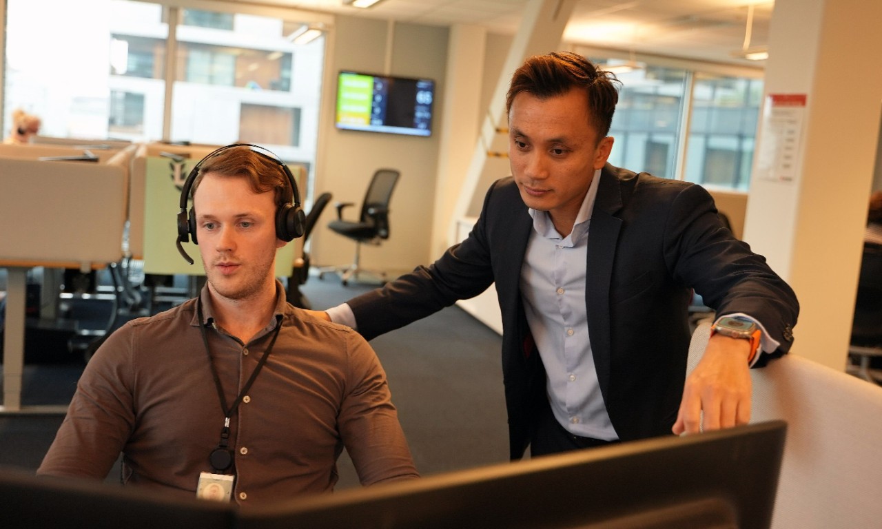 Rådgiver Christer Berge og fagansvarlig Yuen Hui på DNBs kundesenter merker at flere kunder nå tar kontakt.