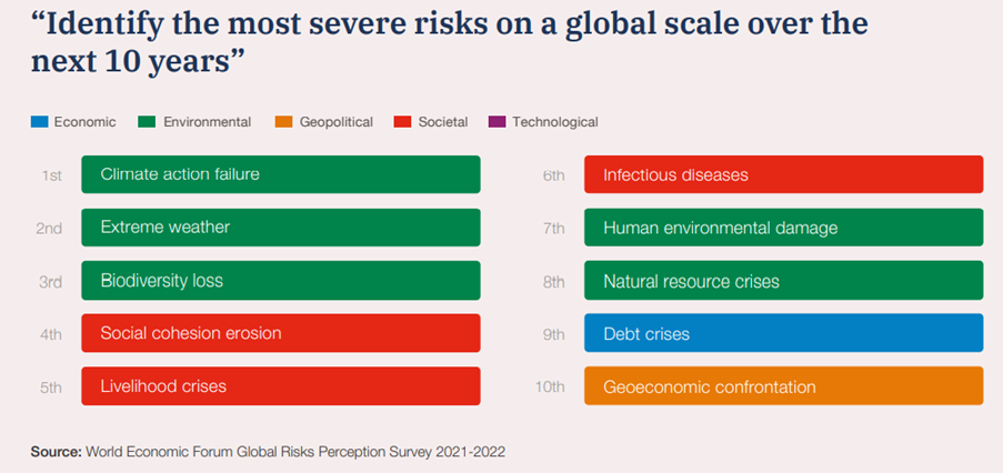 På topp 10-listen over de mest alvorlige risikoene de neste ti årene er fem relatert til miljø, tre til sosiale forhold, én til geopolitisk risiko og én til rent økonomiske forhold.