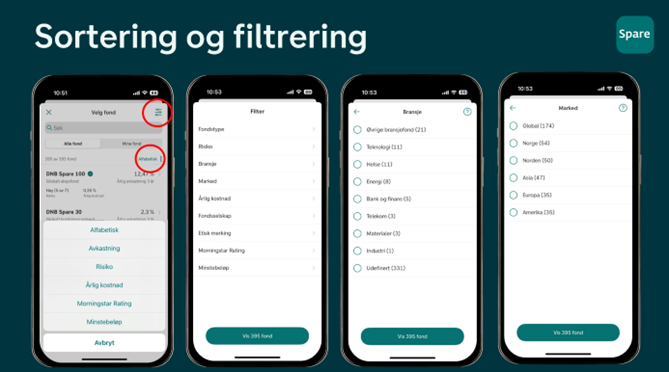 Å komme i gang med sparing i fond er nesten like enkelt som å pynte juletreet. Hos oss heter fondsbutikken Spare og har du lastet ned den, er du godt på vei! Her finner du all sparing og pensjon du har i DNB i dag, og du finner enkle løsninger for å kjøpe fond og å opprette en spareavtale. Og akkurat som i nettbutikken finnes det også her sorterings og filtrerings funksjoner som hjelper deg med å finne riktig fond.