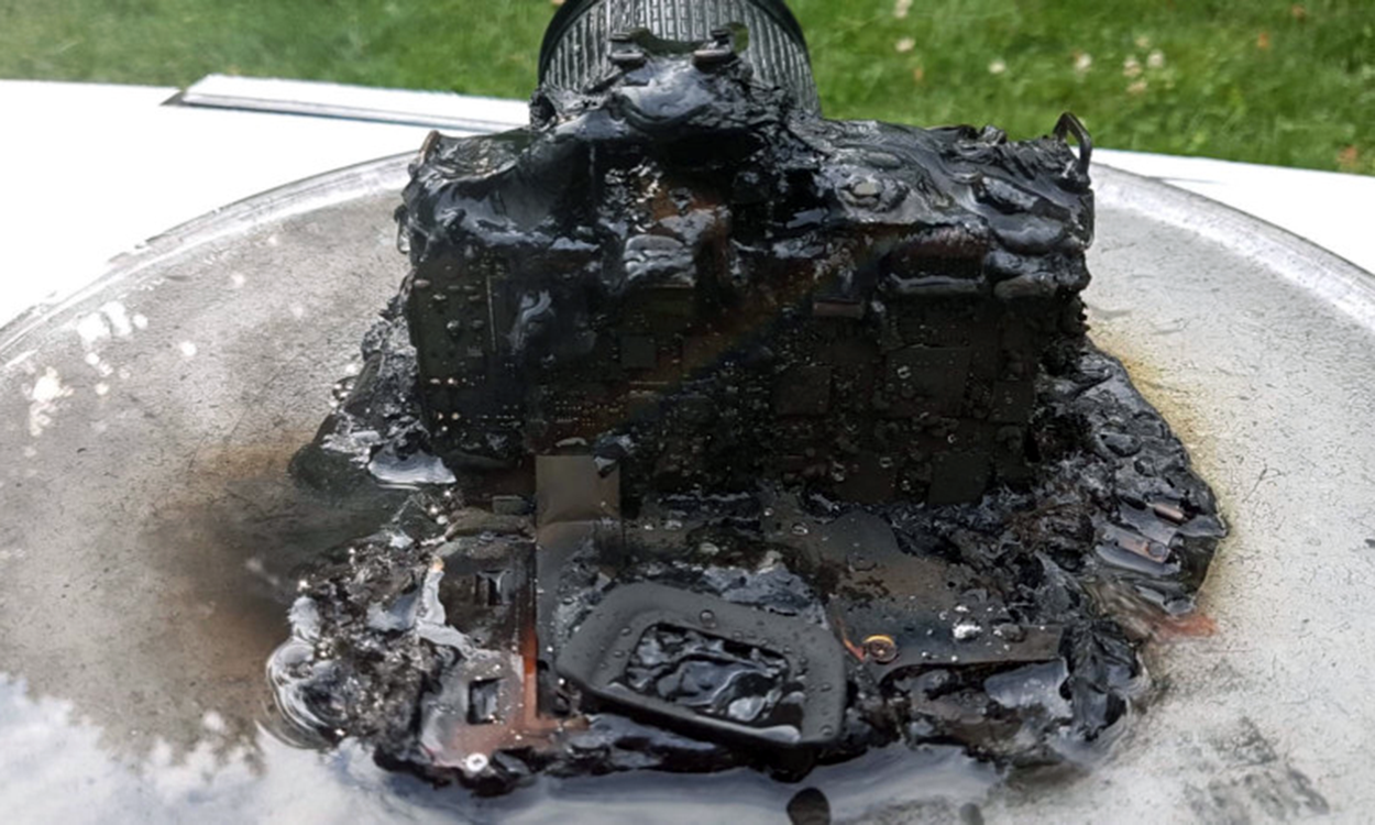 Kameraet på bildet var riktig nok ødelagt etter en tur i mikrobølgeovnen. Framtind har systemer og rutiner som fanger opp en relativt stor andel svindeltilfeller, og etter nærmere undersøkelser fant de nøyaktig samme bilde på nett. Kundens krav ble avslått på grunn av svindel, og ble politianmeldt.
