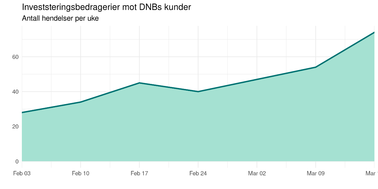 Det opplyser bedrageriekspert i DNB, Terje A. Fjeldvær. Han ser grunn til å varsle om at antall investeringsbedragerier mot DNBs kunder har mer enn doblet seg siden begynnelsen av februar.