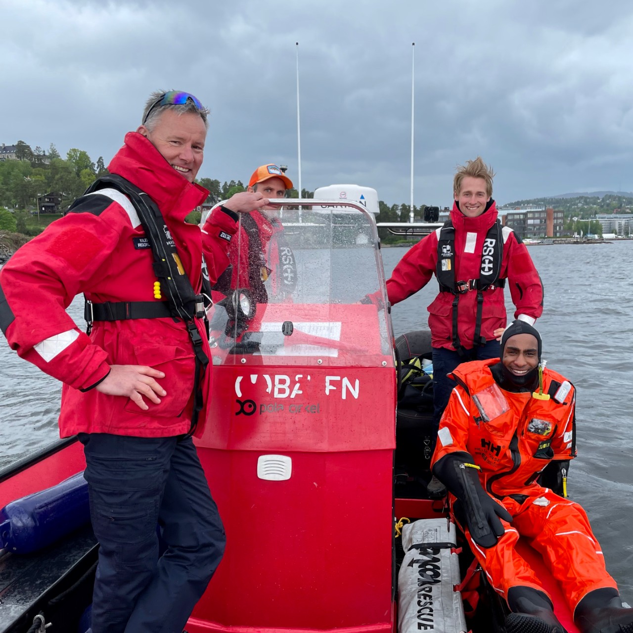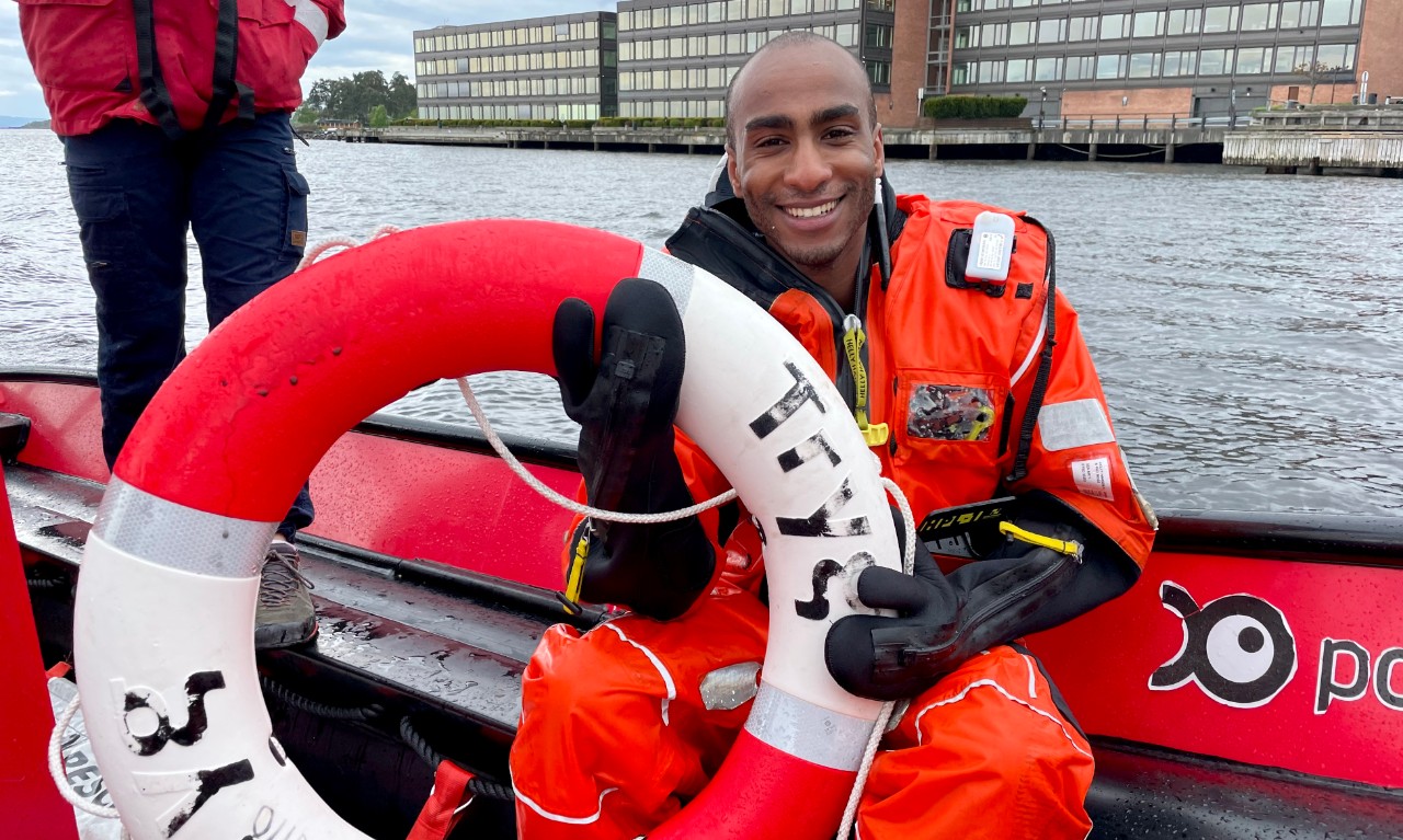 Han står fullt påkledd i en redningsdrakt, ute i Oslofjorden sammen med mannskapet i RS.